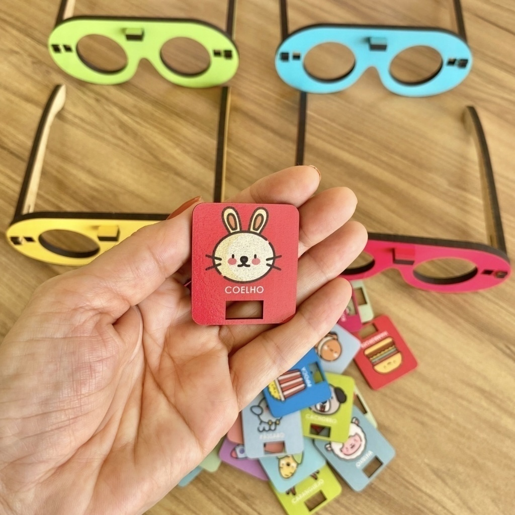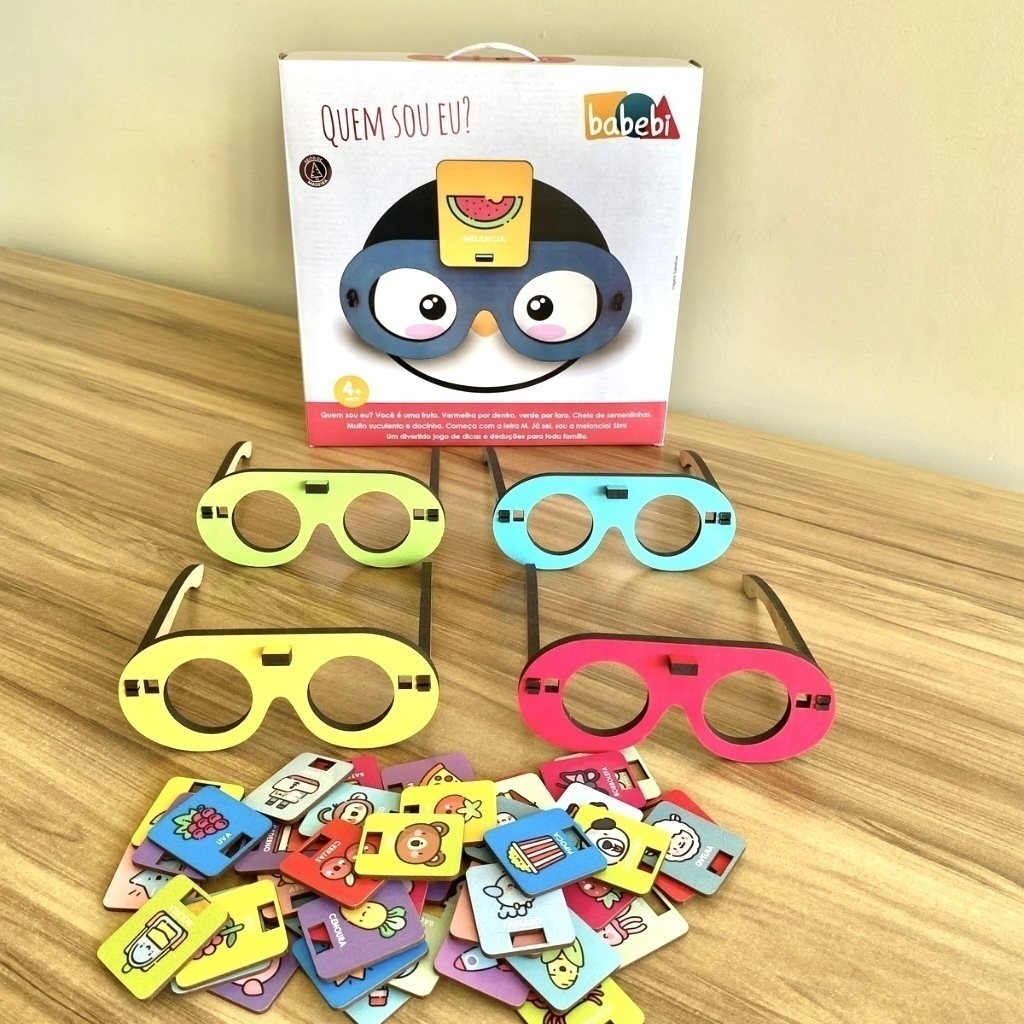 "Quem sou eu?" Você é uma fruta... Vermelhinha por dentro, verde por fora. Cheia de sementinhas. Muito suculenta e docinha. Começa com a letra M... Já sei, sou a melancia!... Um divertido jogo de dicas e deduções para toda a família. Estimula a interação social e o raciocínio lógico. Vem com quatro óculos de madeira, e 48 fichas com figuras e o nome da figura, a criança coloca uma ficha no óculos e coloca ele no rosto, a pessoa que está na frente da criança deve dar dicas para que ela tente adivinhar qual é a figura.